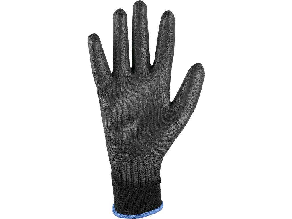 Pletený bezešvý polyester, rukavice s tenkou vrstvou polyuretanu na dlani a prstech a elastickou manžetou.