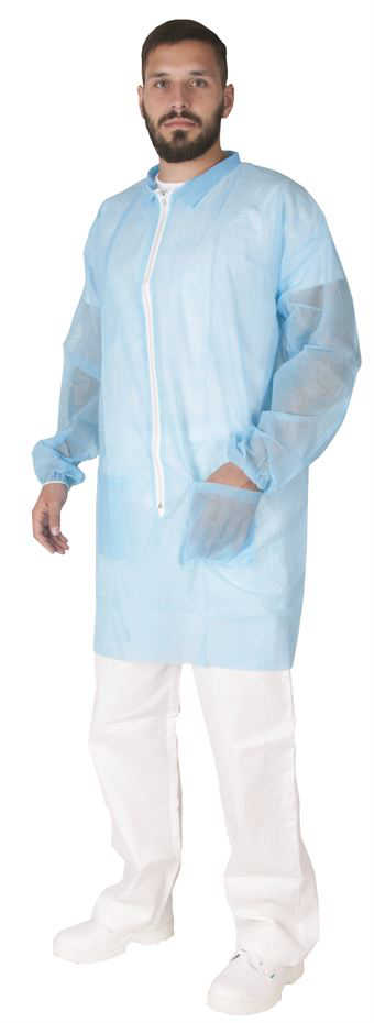 - plášť z polypropylénu- dvě kapsy- zapínání na zip- elastické manžety- balení: 1 sáček - 1 ks- materiál: polypropylen SPP, 40 g/m²- barva: modrá- velikost: L - XXL
