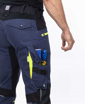 • na pravé nohavici je umístěna multifunkční kapsa na skládací metr, šroubovák a odlamovací nůž s širokými poutky, na levé nohavici je velká dvojitá kapsa krytá patkou na druk