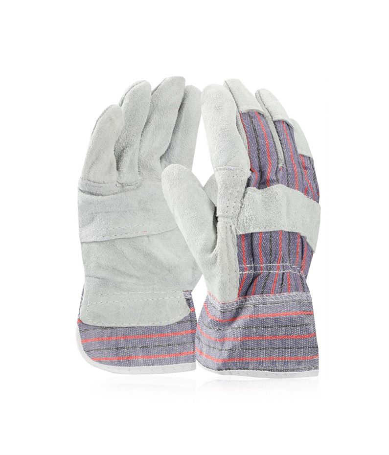 Popis: dělená dlaň z šedé hovězí štípenky, hřbet a manžeta z bavlněné tkaniny