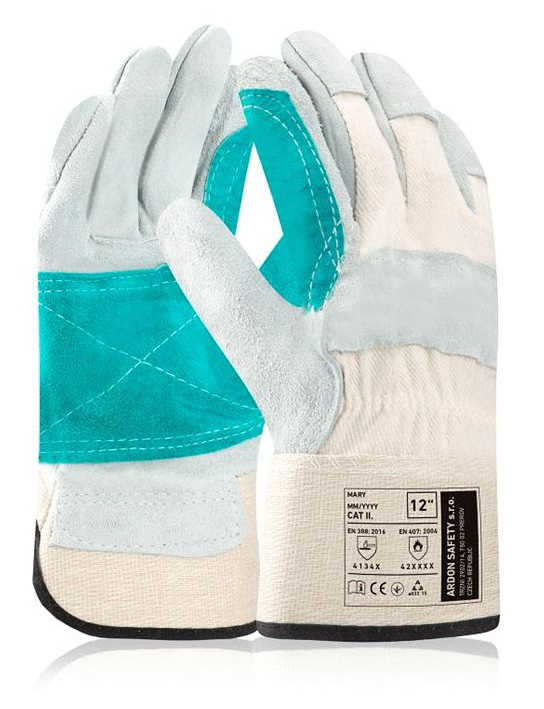 Materiál: zesílená dlaň a ukazovák z hovězí štípenky, hřbet z bavlněné tkaniny, vyztužená manžeta