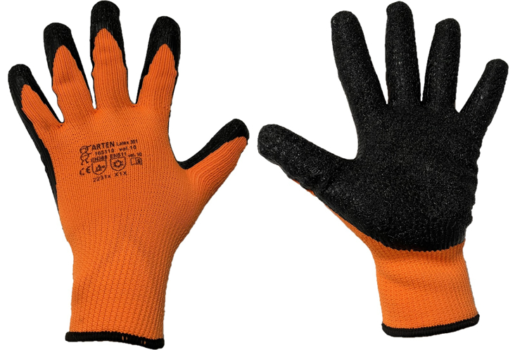 Popis: Zimní bezešvé rukavice z akrylového úpletu, dlaň a prsty povrstveny latexem.