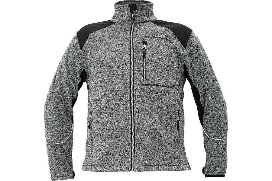 Popis: pánský celopropínací svetr z melírovaného úpletu uvnitř počesaná; zesílená část v oblasti ramen a rukávů sofsthellovým materiálem v kontrastní barvě; 1 náprsní kapsa na zip; 2 postranní kapsy na zip; nastavitelná šíře spodního obvodu; dekorativní reflexní paspulka na rukávu, očko na palec