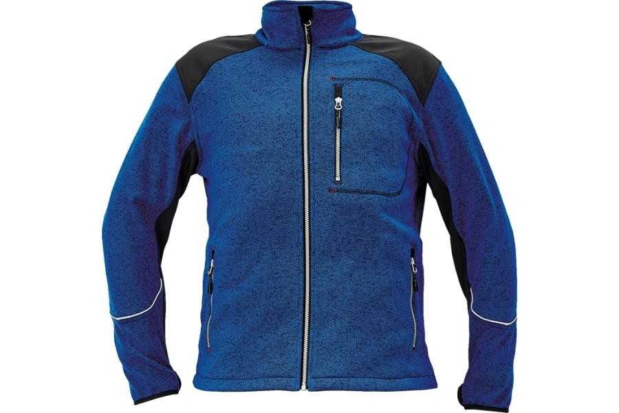 Popis: pánský celopropínací svetr z melírovaného úpletu uvnitř počesaná; zesílená část v oblasti ramen a rukávů sofsthellovým materiálem v kontrastní barvě; 1 náprsní kapsa na zip; 2 postranní kapsy na zip; nastavitelná šíře spodního obvodu; dekorativní reflexní paspulka na rukávu, očko na palec