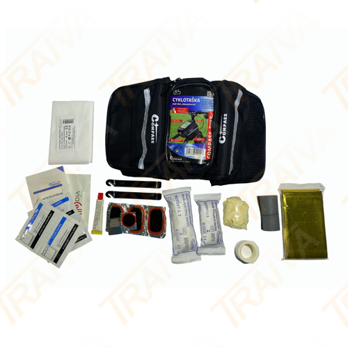 Popis: Lékárnička pro cyklisty se sadou na lepení duší k připevnění na horní část rámu kola. Jednoduché uchycení pomocí pásků se suchým zipem. Uzavíratelné boční kapsy brašny o objemu 0,75 litrů poskytují dostatečný prostor pro umístění lékárničky i dalších důležitých věcí. Oddělitelná kapsa na telefon je umístěna z vrchní strany.