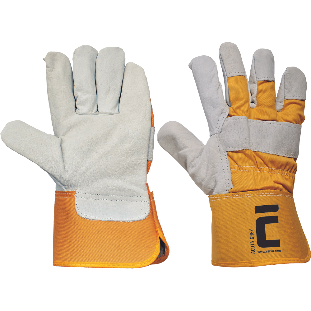 Rukavice z hovězí štípenky s podšívkou a zesílenou vrstvou v dlani, s bílou bavlněnou tkaninou na hřbetu a s tuhou manžetou.