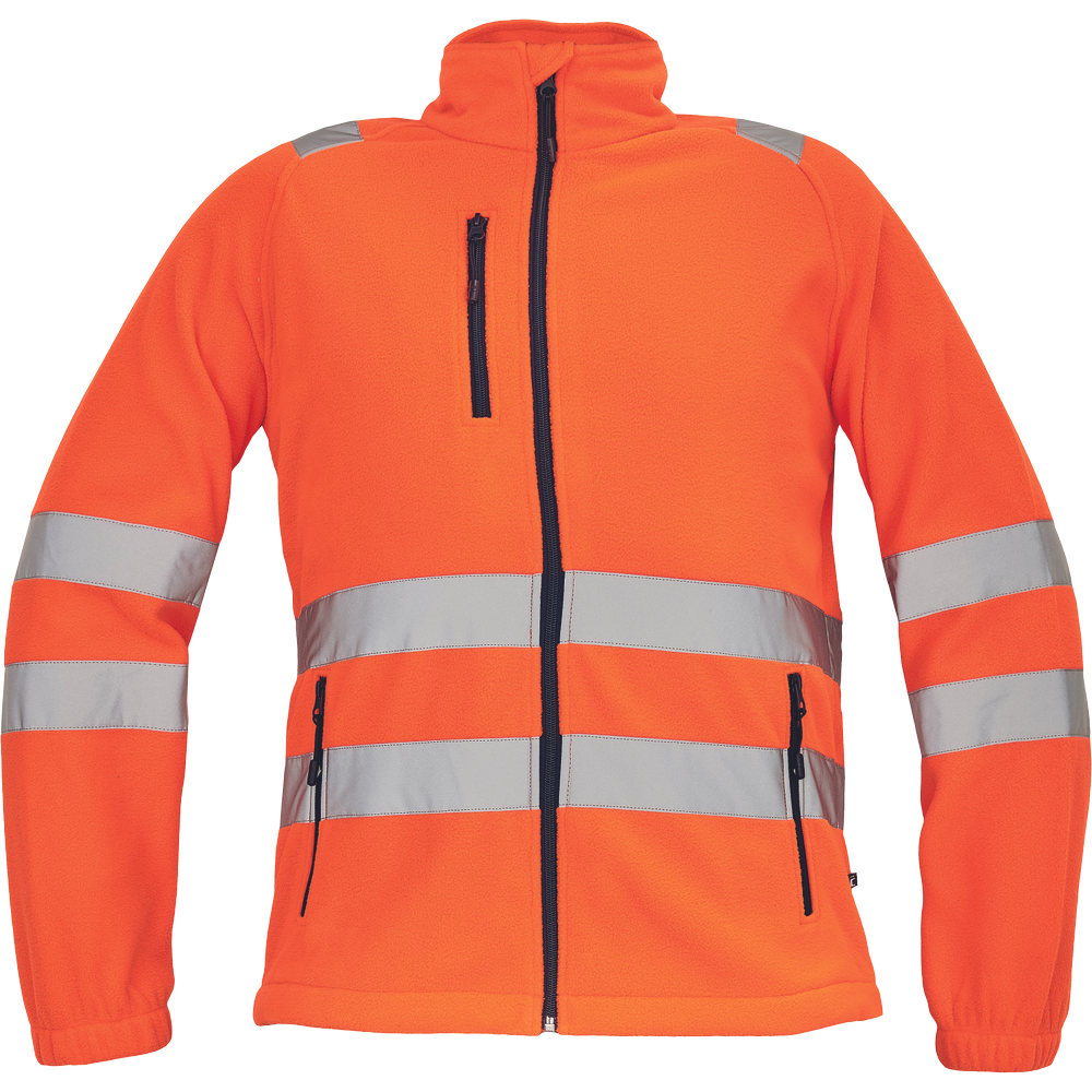 Popis: pánská full HI-VIS fleecová mikina s reflexními pruhy přes ramena, v bocích a na rukávech; zapínání na zip; 1 náprsní kapsa a 2 postranní kapsy na zip; elastické lemy rukávů a boků.