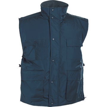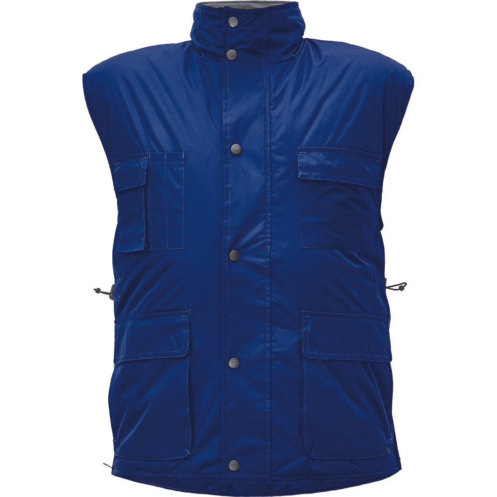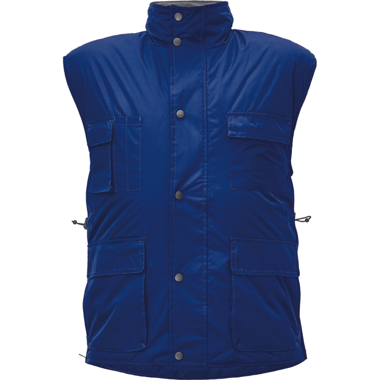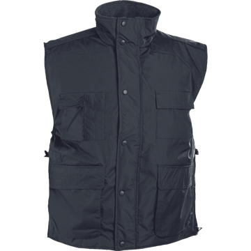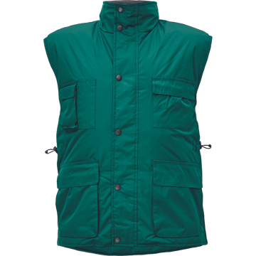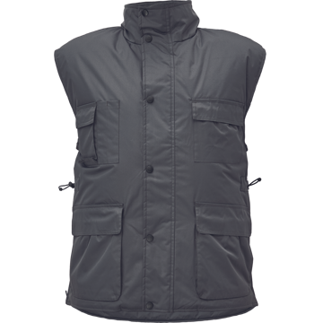 Popis: zateplená nepromokavá pánská zimní vesta; prodloužený díl na zádech; polyesterový materiál s mechanicky odolnou úpravou RipStop; 2 přední kapsy, 2 náprsní kapsy; spodní lem ke stažení na šňůrku; na bocích je polohování na zip pro regulaci obvodu vesty