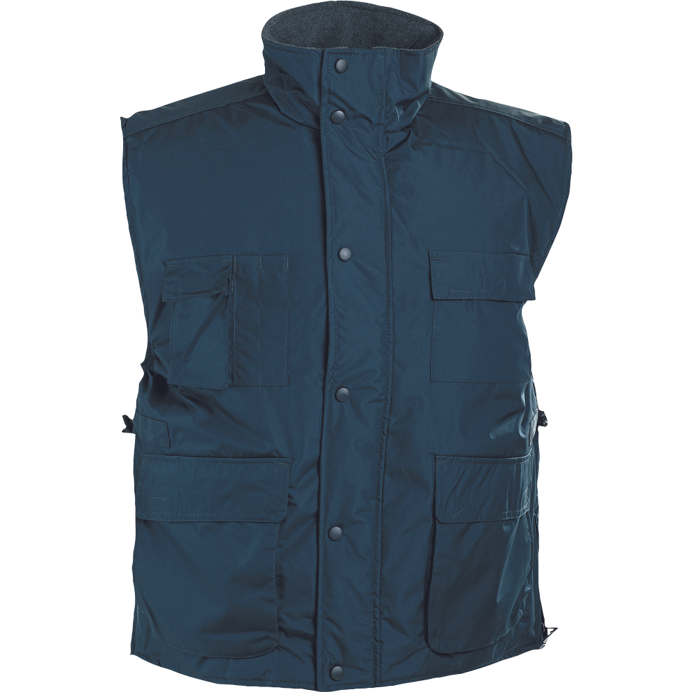 Popis: zateplená nepromokavá pánská zimní vesta; prodloužený díl na zádech; polyesterový materiál s mechanicky odolnou úpravou RipStop; 2 přední kapsy, 2 náprsní kapsy; spodní lem ke stažení na šňůrku; na bocích je polohování na zip pro regulaci obvodu vesty