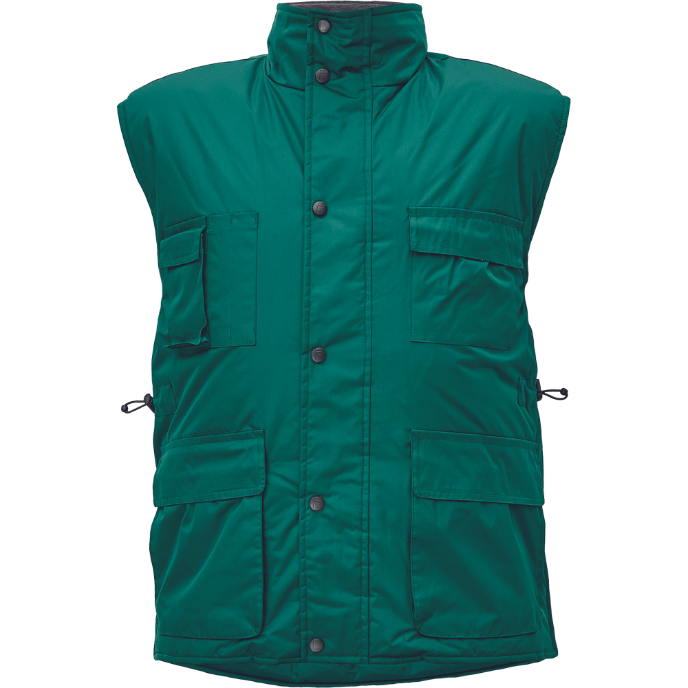 Popis: zateplená nepromokavá pánská zimní vesta; prodloužený díl na zádech; polyesterový materiál s mechanicky odolnou úpravou RipStop; 2 přední kapsy, 2 náprsní kapsy; spodní lem ke stažení na šňůrku; na bocích je polohování na zip pro regulaci obvodu vesty.
