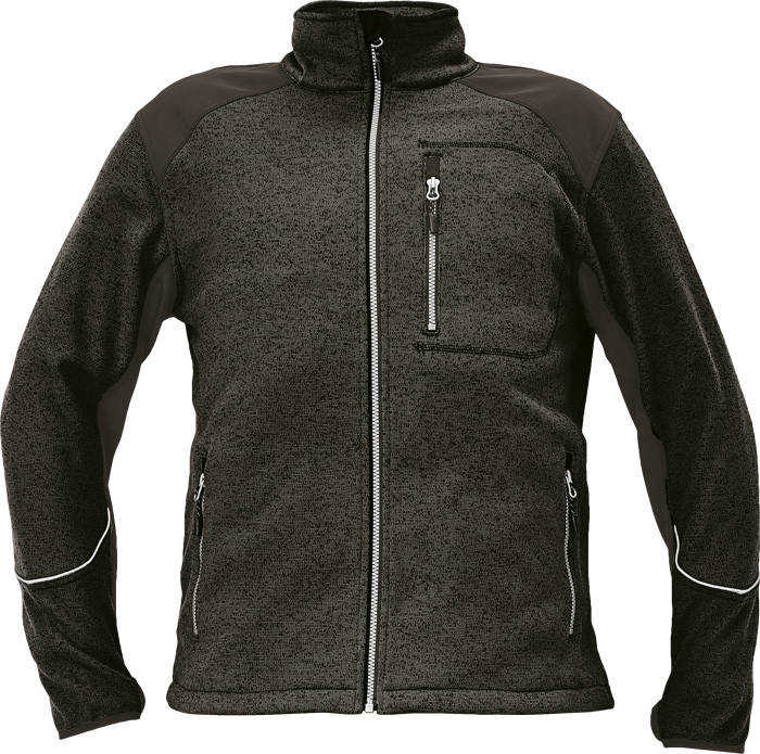 Popis: pánský celopropínací svetr z melírovaného úpletu uvnitř počesaná; zesílená část v oblasti ramen a rukávů sofsthellovým materiálem v kontrastní barvě; 1 náprsní kapsa na zip; 2 postranní kapsy na zip; nastavitelná šíře spodního obvodu; dekorativní reflexní paspulka na rukávu, očko na palec