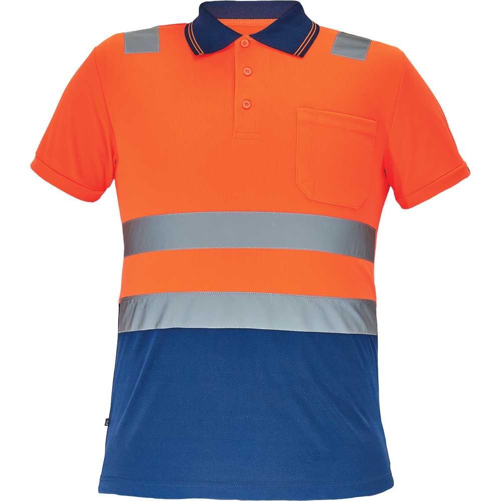 Popis: pánská full HI-VIS polokošile s reflexními pruhy přes ramena a v bocích; zapínání na 3 knoflíky; 1 náprsní kapsička; žebrovaný límeček a lemy rukávů