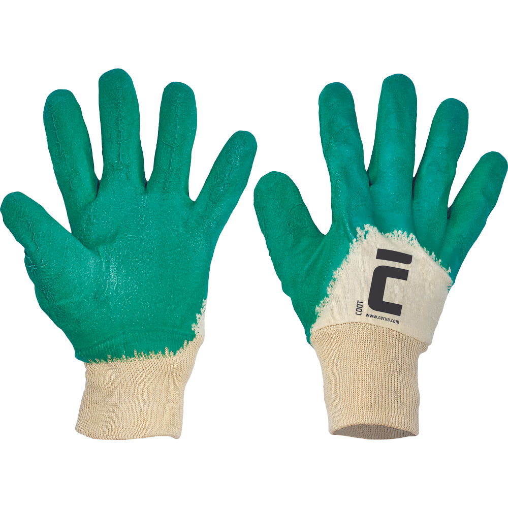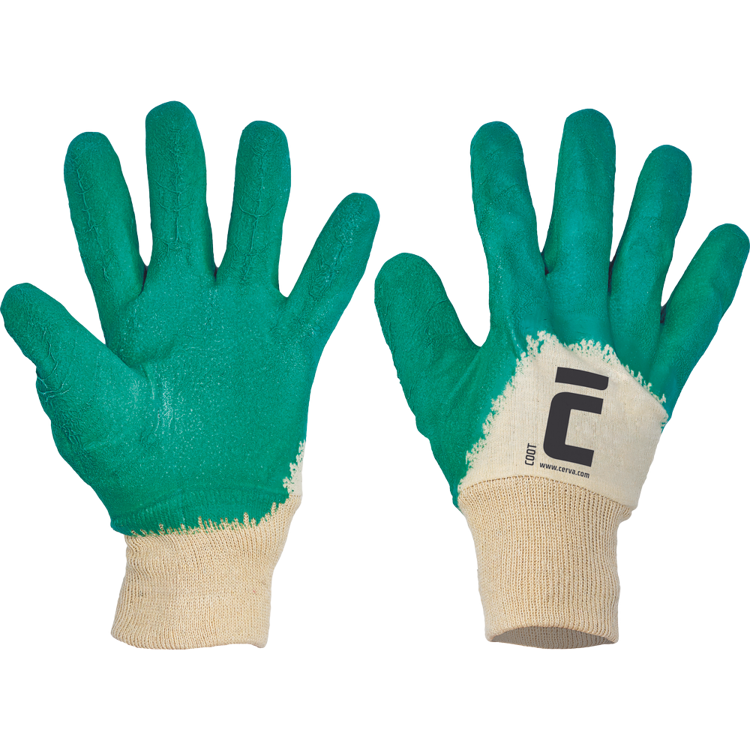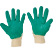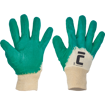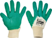 Rukavice šité z bavlněného úpletu, s protiskluzovým povrchem, pružným nápletem na zápěstí a máčenými dlaněmi a prsty v kaučuku.