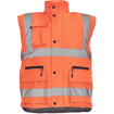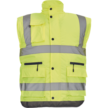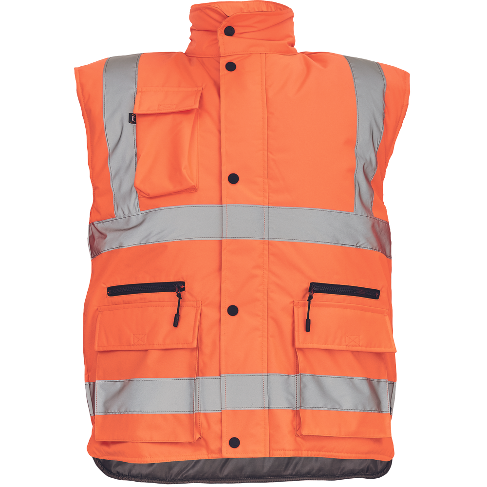 Popis: pánská zateplená full HI-VIS vesta s reflexními pruhy přes ramena a v bocích; kapuce skrytá v límci; zapínání na zip kryté légou se zapínáním na druky; 2 přední multifunkční kapsy s klopou a zapínáním na zip; 1 náprsní kapsa s klopou