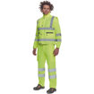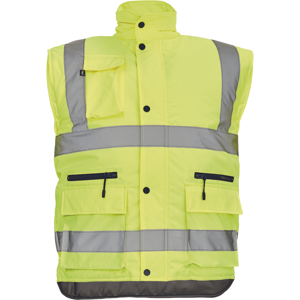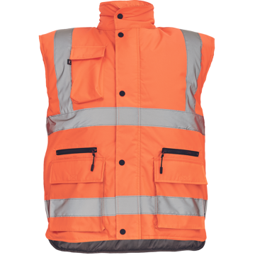 Popis: pánská zateplená full HI-VIS vesta s reflexními pruhy přes ramena a v bocích; kapuce skrytá v límci; zapínání na zip kryté légou se zapínáním na druky; 2 přední multifunkční kapsy s klopou a zapínáním na zip; 1 náprsní kapsa s klopou