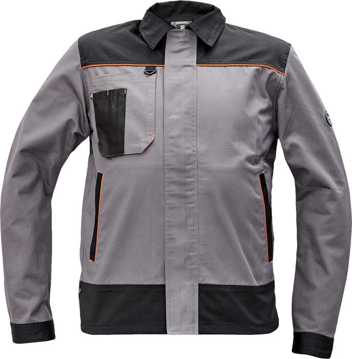 pánská pracovní bunda; zesílená oblast ramen materiálem Oxford 600D; 2 boční lištové kapsy, 1 multifunkční náprsní kapsa; kontrastní paspulky; nastavitelná šíře rukávu na suchý zip.