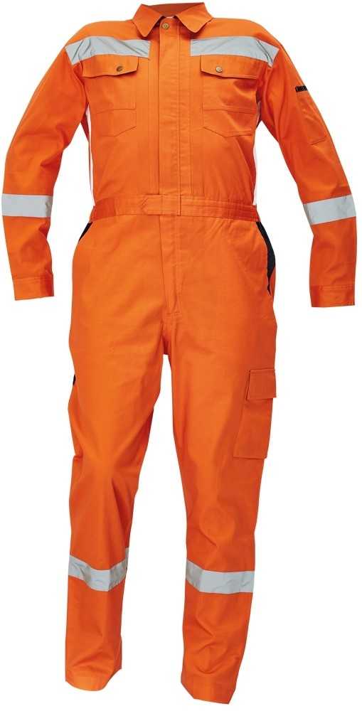 Popis: pánský pracovní overal s límcem a zapínáním krytým légou • reflexní pruhy na rukávech a spodní části nohavic • elastická vsadka v zadní části • odvětrávání po stranách • 6 velkých multifunkčních kapes • zapínání rukávů na druky