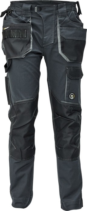 Popis: pánské pracovní kalhoty, elastický inovativní materiál TRIFIBETEX, ergonomický střih, snížený pružný pas, odolné trojité prošití nohavic a sedu, zesílená kapsa na nákoleníky z materiálu Oxford, prostorné multifunkční přední kapsy s poutky na nářadí, 2 zadní kapsy s klopou zesílené Oxfordem, stehenní kapsa na telefon s klopou a zapínáním na suchý zip, kapsa na metr a nůž, poutko na kladivo, "D" kroužek, poutko nanářadí v pase, originální zpracování zapínání kalhot, reflektivní prvky v barevném odstínu, nastavitelná délka nohavic.