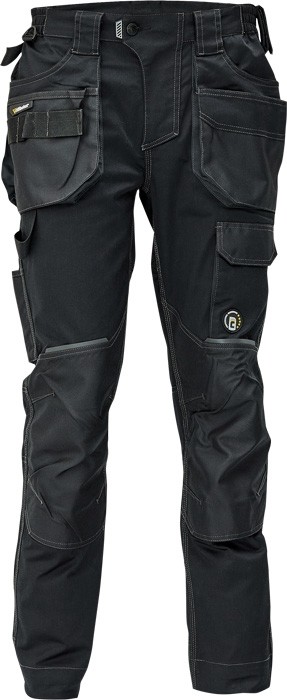 Popis: pánské pracovní kalhoty, elastický inovativní materiál TRIFIBETEX, ergonomický střih, snížený pružný pas, odolné trojité prošití nohavic a sedu, zesílená kapsa na nákoleníky z materiálu Oxford, prostorné multifunkční přední kapsy s poutky na nářadí, 2 zadní kapsy s klopou zesílené Oxfordem, stehenní kapsa na telefon s klopou a zapínáním na suchý zip, kapsa na metr a nůž, poutko na kladivo, "D" kroužek, poutko nanářadí v pase, originální zpracování zapínání kalhot, reflektivní prvky v barevném odstínu, nastavitelná délka nohavic.