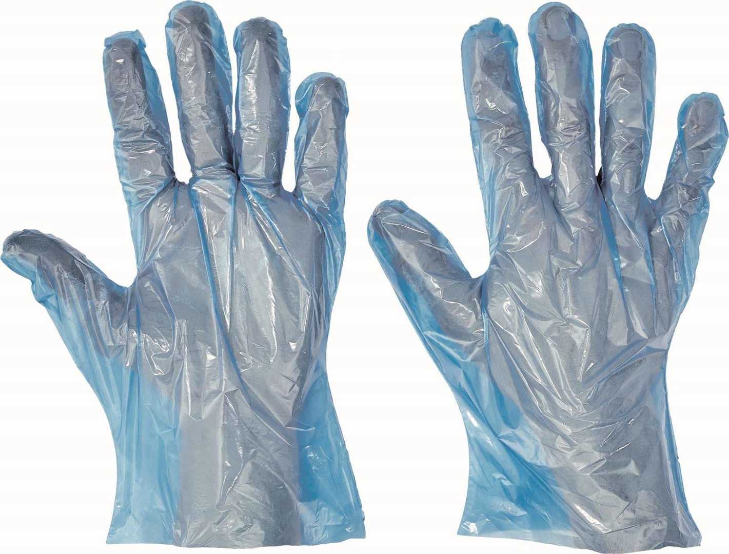 Jednorázové rukavice z polyetylénové fólie vhodné pro krátkodobý styk s potravinami.