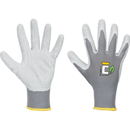 • odolné eco-frindly pracovní rukavice • pětiprsté bezešvé rukavice jsou vyrobeny z šedé recyklované polyesterové příze, která zajišťuje pevnost a pohodlí po celý den • dlaň je potažena šedým zvrásněným latexem, který zajišťuje vynikající přilnavost a odolnost proti oděru za sucha i za mokra • ideální volba pro náročnou práci