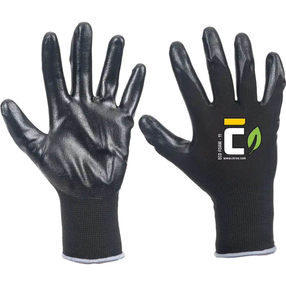• černé bezešvé pěnové nitrilové rukavice • pětiprsté bezešvé rukavice jsou vyrobeny z černé recyklované polyesterové příze pro pohodlné nošení • dlaň je potažena pěnovým nitrilem, který zajišťuje vynikající přilnavost, pružnost a je ideální pro přesnou manipulaci ve vlhkém a olejnatém průmyslovém prostředí • spolehlivé, ekologické řešení pro náročné pracovní podmínky
