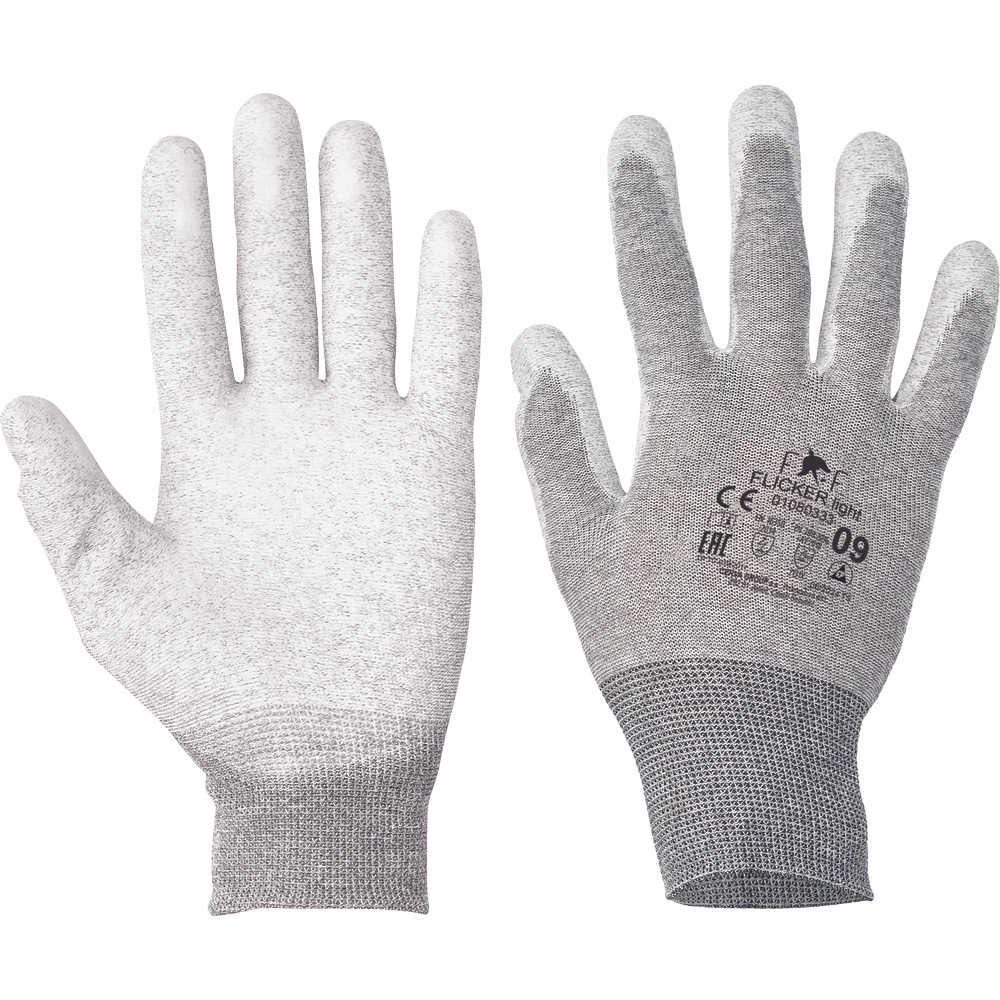 Pletené bezešvé antistatické polyesterové rukavice s integrovaným uhlíkovým vláknem, vrstvou polyuretanu v dlani a na prstech a pružnou manžetou.