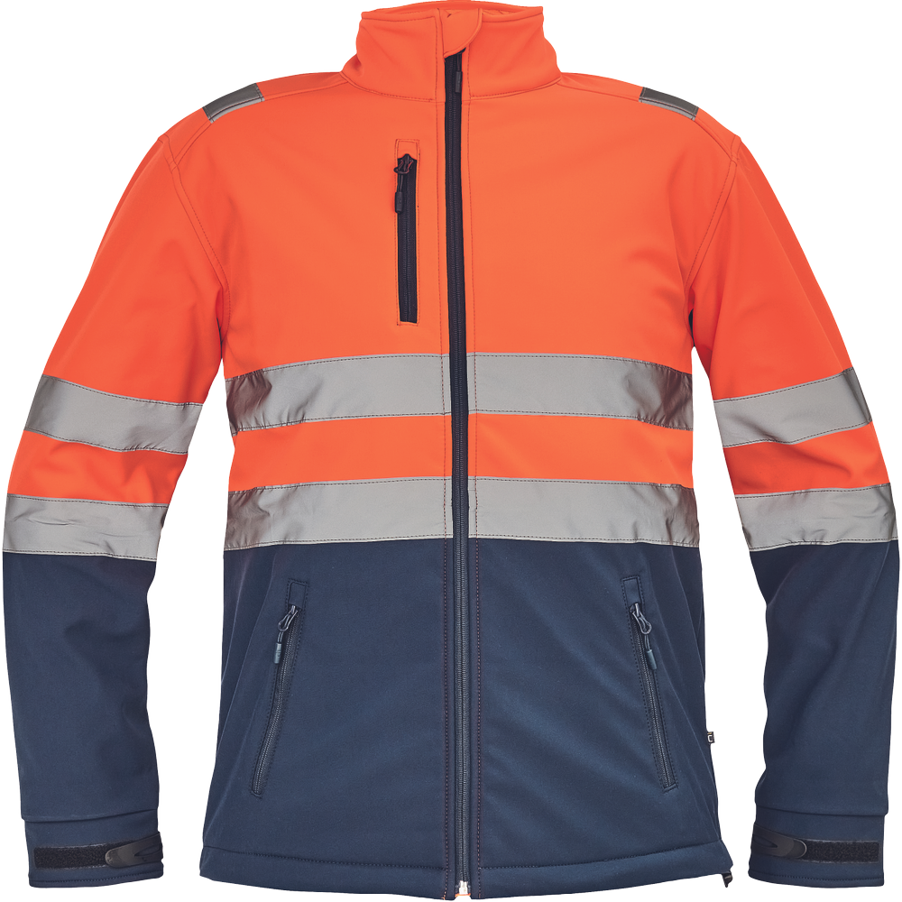 Popis: pánská HI-VIS softshellová bunda s reflexními pruhy přes ramena, v bocích a na rukávech; prodyšná TPU membrána odolná dešti; zapínání na zip; 1 náprsní kapsa a 2 postranní kapsy na zip; elastické lemy rukávů a boků