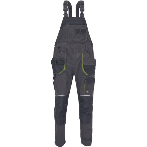 • pánské pracovní kalhoty s laclem, pružným pasem a multifunkčními kapsami • Oxford 600D zesílení kolenních kapes pro vkládání ochranných nákoleníků • odolné trojité prošití nohavic a sedu • reflexní prvky • nastavitelná délka nohavic