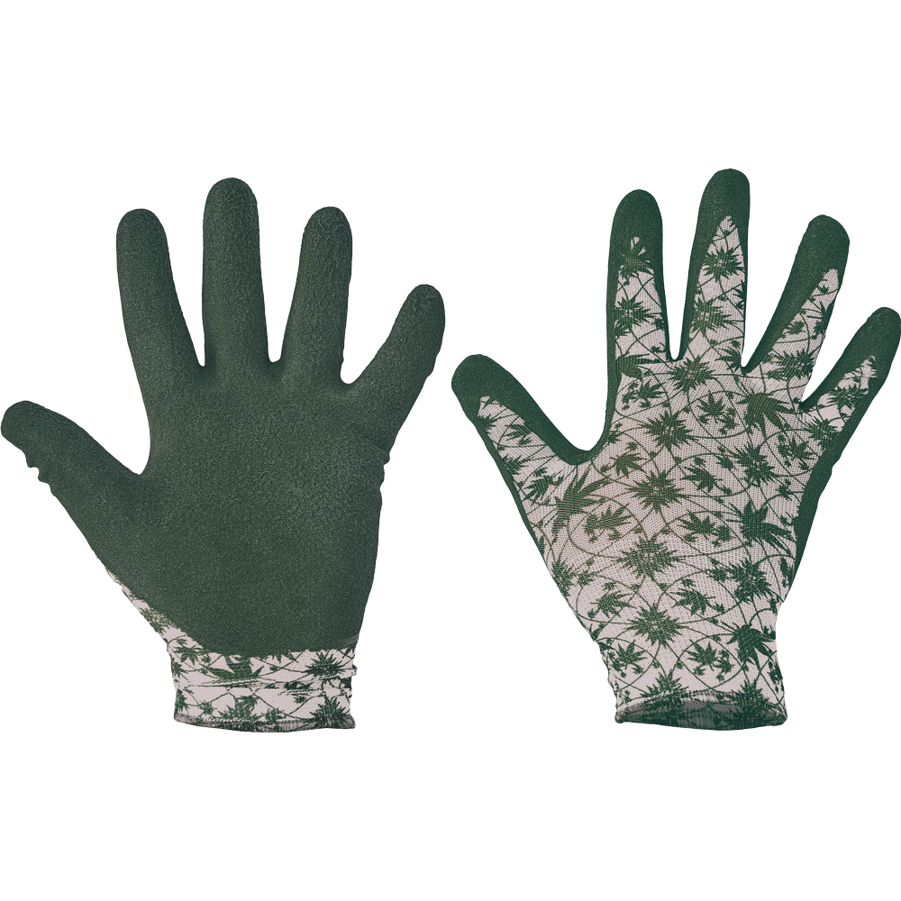 Bezešvé pletené rukavice ze syntetické příze s nánosem latexu na dlani a prstech. Pružná manžeta.