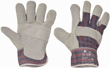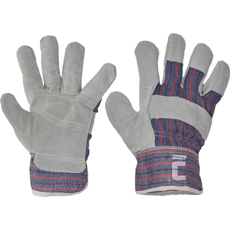 Rukavice z hovězí štípenky v dlani s podšívkou, hřbet a manžeta z bavlněné tkaniny.