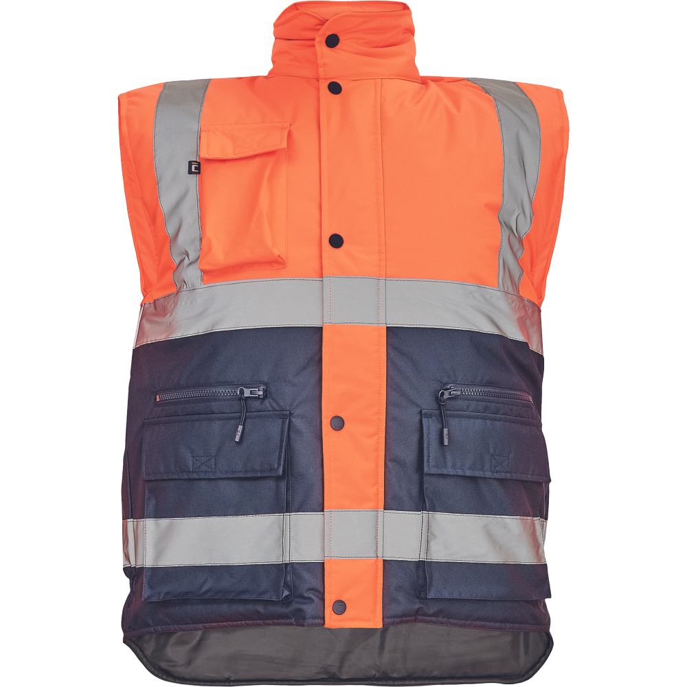 Popis: pánská zateplená HI-VIS vesta s reflexními pruhy přes ramena a v bocích; kapuce skrytá v límci; zapínání na zip kryté légou se zapínáním na druky; 2 přední multifunkční kapsy s klopou a zapínáním na zip; 1 náprsní kapsa s klopou.