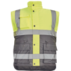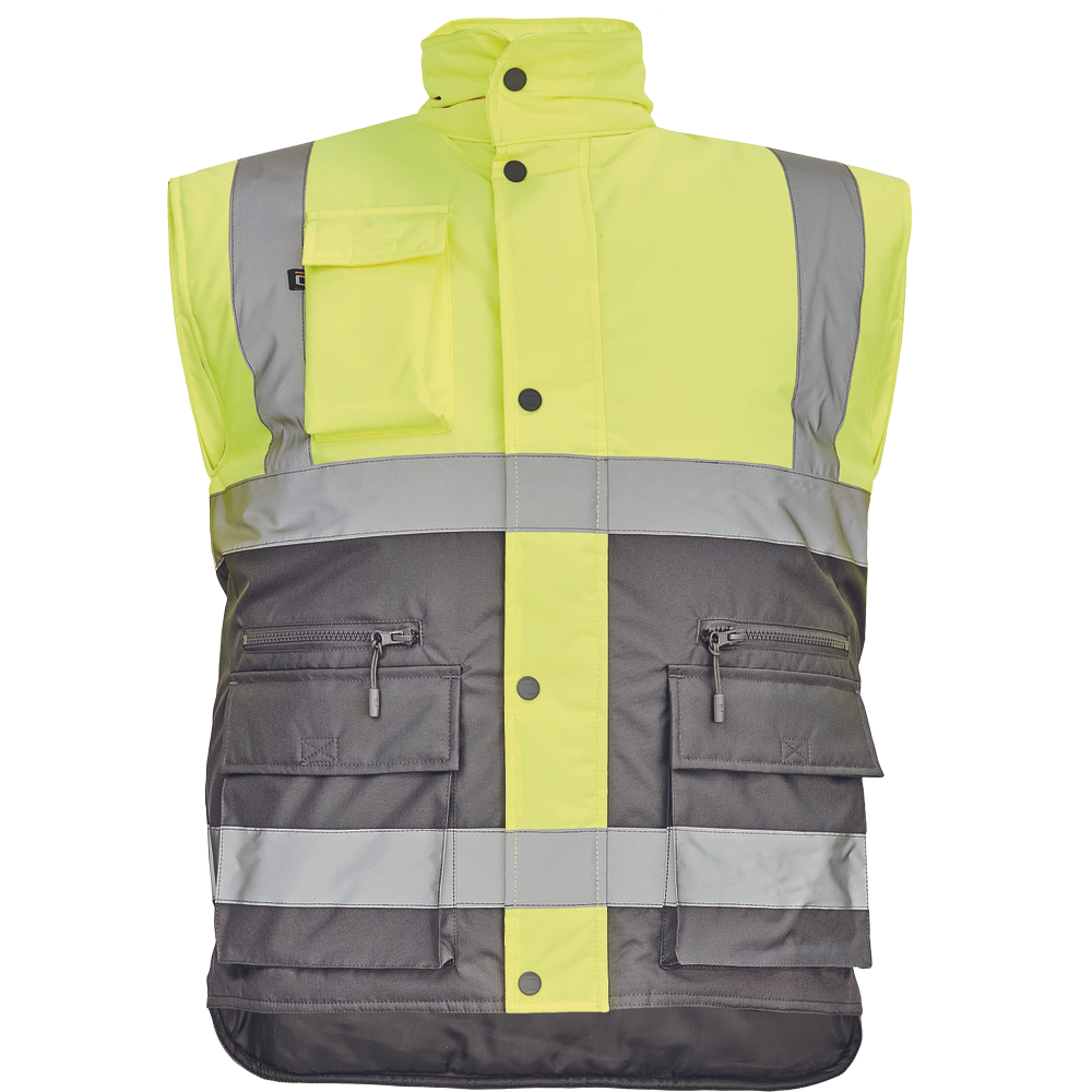 Pánská zateplená HI-VIS vesta s reflexními pruhy přes ramena a v bocích.