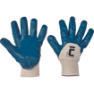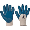 Rukavice šité z bavlněného úpletu, polomáčené v nitrilu, s pružnou manžetou.