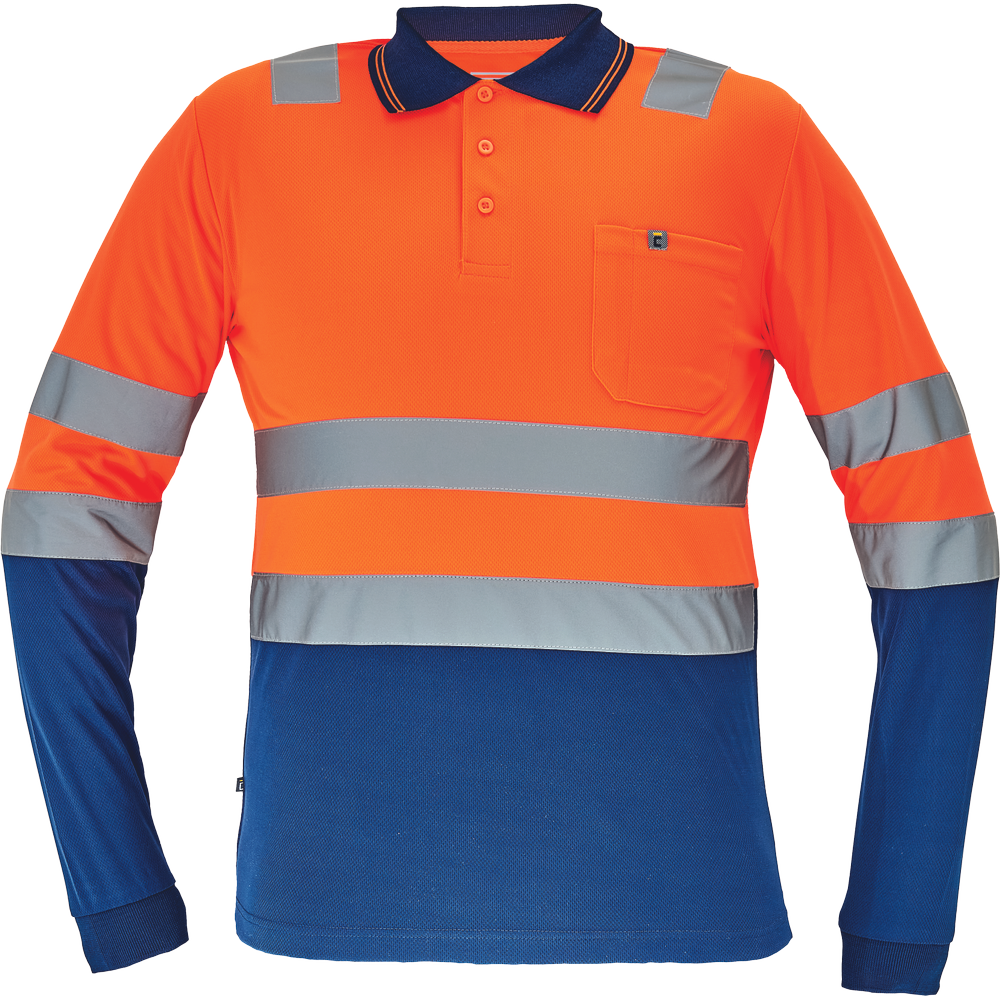 Popis: pánská HI-VIS polokošile s dlouhým rukávem; reflexní pruhy přes ramena a v bocích; zapínání na 3 knoflíky; 1 náprsní kapsička; elastické lemy rukávů.
