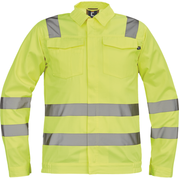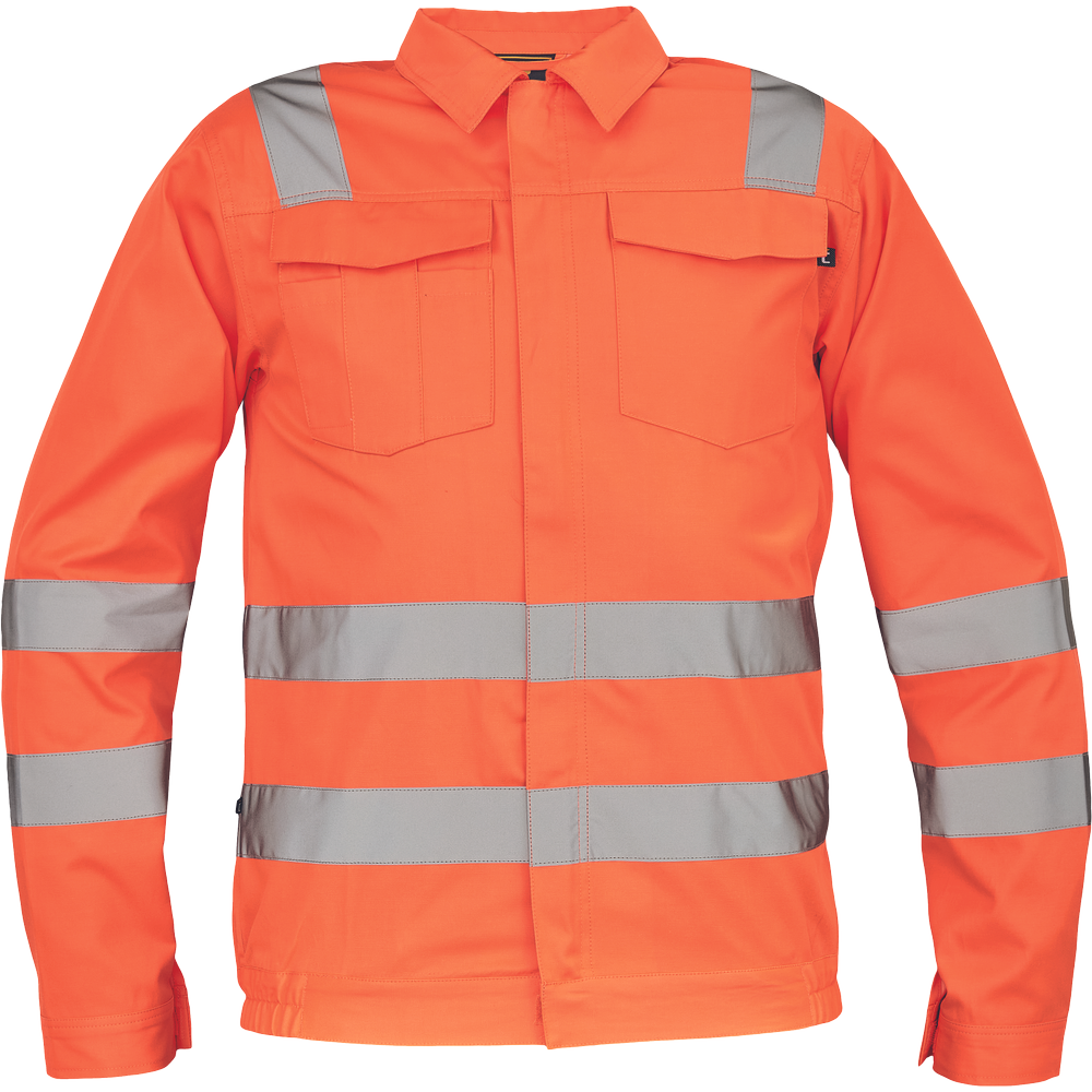 Popis: pánská lehká full HI-VIS pracovní bunda s reflexními pruhy přes ramena, v bocích a na rukávech; zapínání na zip kryté légou na suchý zip; 2 náprsní kapsy s klopou; nastavitelná šířka rukávů pomocí suchého zipu; elastický lem boků