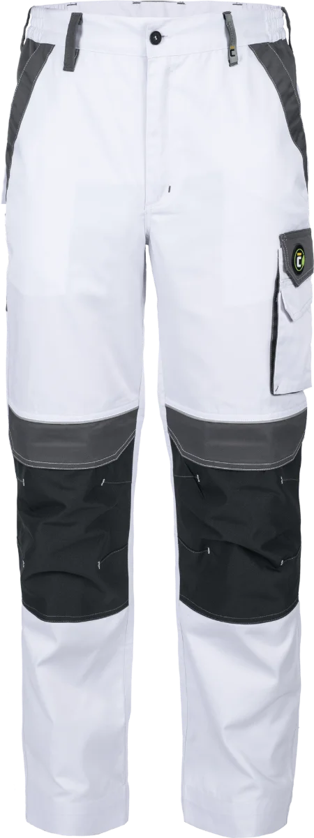 • pánské pracovní kalhoty s elastickým pasem • 2 přední kapsy • 1 levá stehenní kapsa • 2 zadní kapsy se zapínáním na suchý zip • zesílená oblast kolen s možností vložení chráničů kolen • reflexní prvky • nastavitelná délka nohavic