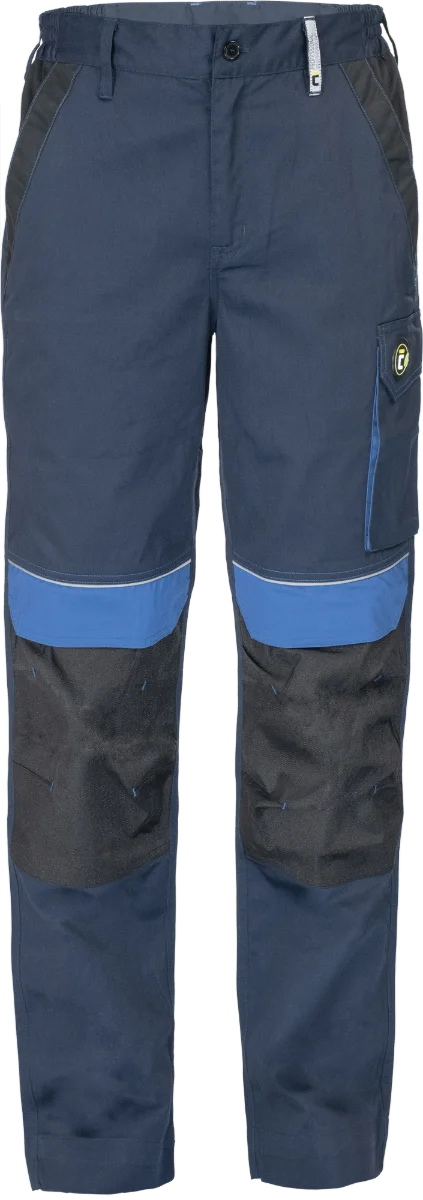 • pánské pracovní kalhoty s elastickým pasem • 2 přední kapsy • 1 levá stehenní kapsa • 2 zadní kapsy se zapínáním na suchý zip • zesílená oblast kolen s možností vložení chráničů kolen • reflexní prvky • nastavitelná délka nohavic