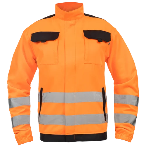 • unisex HI-VIS pracovní bunda se zapínáním na zip krytým légou • 2 boční kapsy • 2 náprsní kapsy s klopou na suchý zip • 2 šité 5 cm široké reflexní pruhy přes boky a spodní rukávy • zesílení namáhaných částí ramen • pružné manžety rukávů a spodní obvod v pase