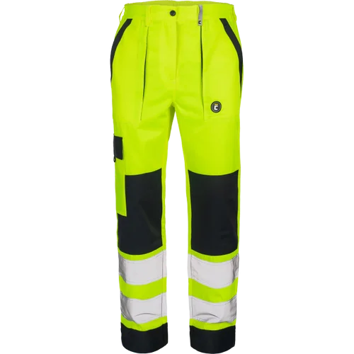 • dámské HI-VIS pracovní kalhoty s elastickým pasem • 2 přední kapsy • 1 stehenní kapsa • 2 zadní kapsy se zapínáním na suchý zip • 2 šité 7,5 cm široké reflexní pruhy na spodních částech nohavic • zesílená oblast kolen • nastavitelná délka nohavic