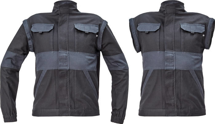 pánská pracovní bunda se zapínáním na zip krytým légou; odepínatelné rukávy; 2 přední kapsy, 2 náprsní kapsy; zesílení namáhaných míst loktů a ramen; pružné manžety rukávů a spodní obvod v pase.