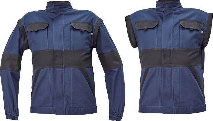 pánská pracovní bunda se zapínáním na zip krytým légou; odepínatelné rukávy; 2 přední kapsy, 2 náprsní kapsy; zesílení namáhaných míst loktů a ramen; pružné manžety rukávů a spodní obvod v pase.