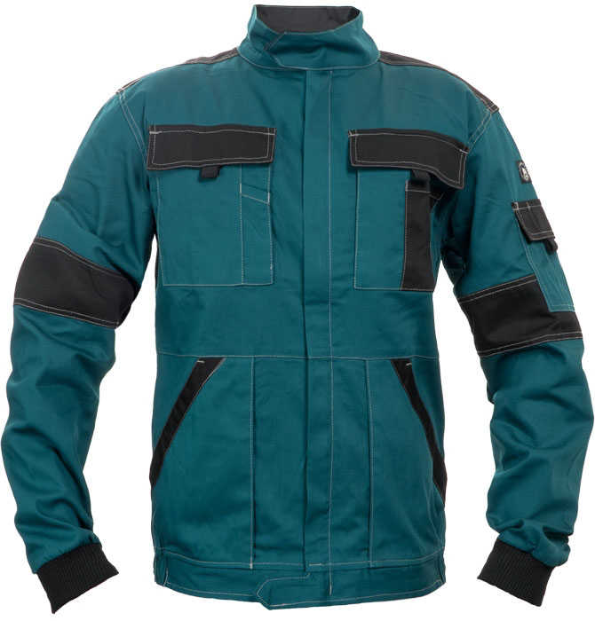 • pánská lehká pracovní bunda se zapínáním na zip krytým légou • 2 přední kapsy • 2 náprsní kapsy s klopou • 1 malá kapsa na levém rukávu • zesílení namáhaných míst loktů a ramen • pružné manžety rukávů a spodní obvod v pase