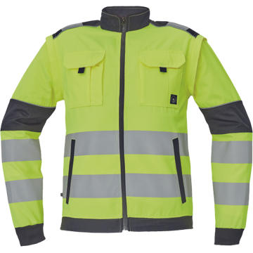 Popis: pánská HI-VIS pracovní bunda se zapínáním na zip; odepínatelné rukávy; 2 přední kapsy, 2 náprsní kapsy; Oxford 600D zesílení v oblasti ramen; dvojice tištěných 7 cm reflexních pruhů přes zadní obvod pasu a rukávů; 2 menší pruhy přes ramena; reflexní paspulky lemující zesílené části rukávů a ramen; pružné náplety manžet rukávů a elastický spodní obvod pasu.