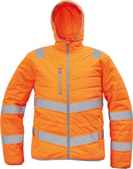 Popis: zateplená zimní bunda hi-vis s reflektivními pruhy; 2 boční kapsy na zip; 1 hrudní kapsa na zip; 1 vnitřní kapsa na zip; elastické paspulky na obvodu rukávu, kapuce a spodního lemu