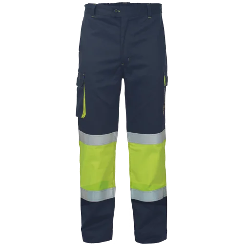 • pánské HI-VIS multinormní kalhoty s elastickým pasem • 2 boční kapsy • 2 stehenní kapsy s klopou na suchý zip • 2 zadní kapsy na suchý zip • dvojice 5 cm šitých reflexních pruhů okolo lýtek • nastavitelná délka nohavic