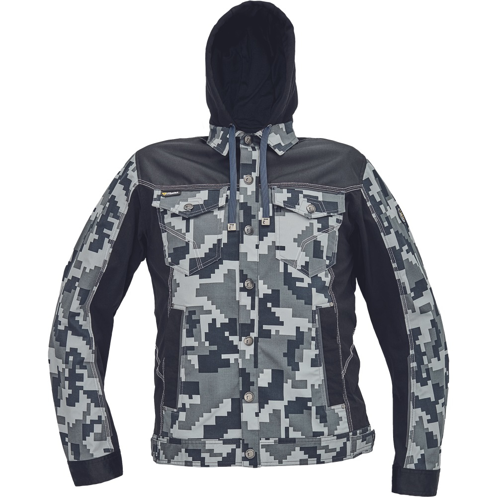 pánská pracovní bunda v módním přírodním maskování s odepínací kapucí a zapínáním na druky; elastický inovativní materiál TRIFIBETEX® v kombinaci se 4way strečovým materiálem TRIFIBETEXPRO®; trojité prošívání, CORDURA zesílení v oblasti ramen; 2 boční kapsy, 2 náprsní kapsy na druky; nastavitelná šíře rukávů se zapínáním na druky; reflexní prvky v barevném odstínu.