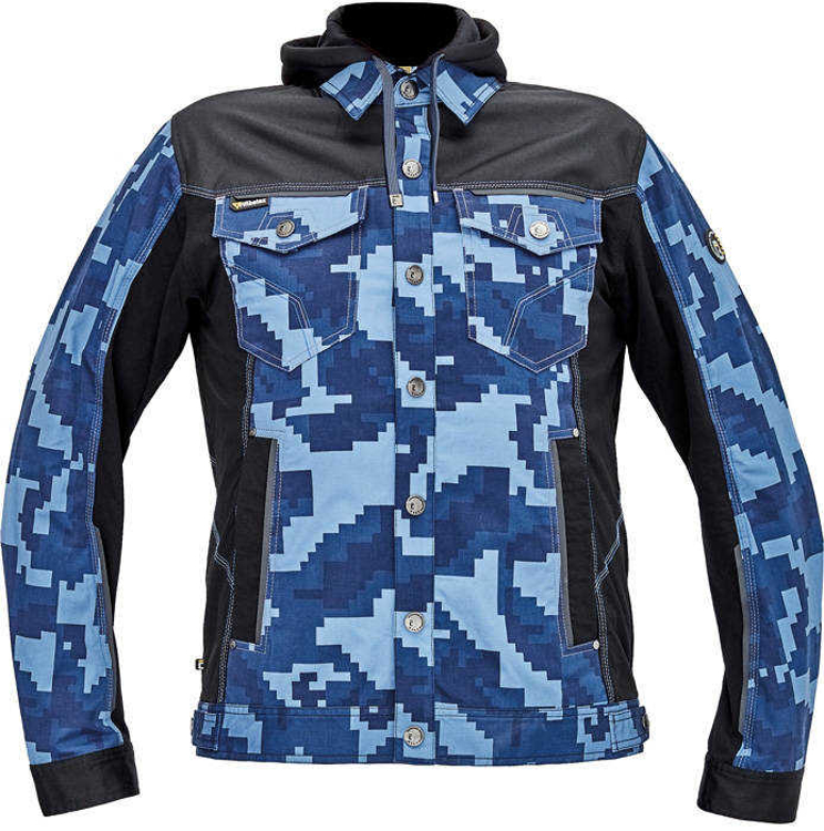 pánská pracovní bunda v módním přírodním maskování s odepínací kapucí a zapínáním na druky; elastický inovativní materiál TRIFIBETEX® v kombinaci se 4way strečovým materiálem TRIFIBETEXPRO®; trojité prošívání, CORDURA zesílení v oblasti ramen; 2 boční kapsy, 2 náprsní kapsy na druky; nastavitelná šíře rukávů se zapínáním na druky; reflexní prvky v barevném odstínu.