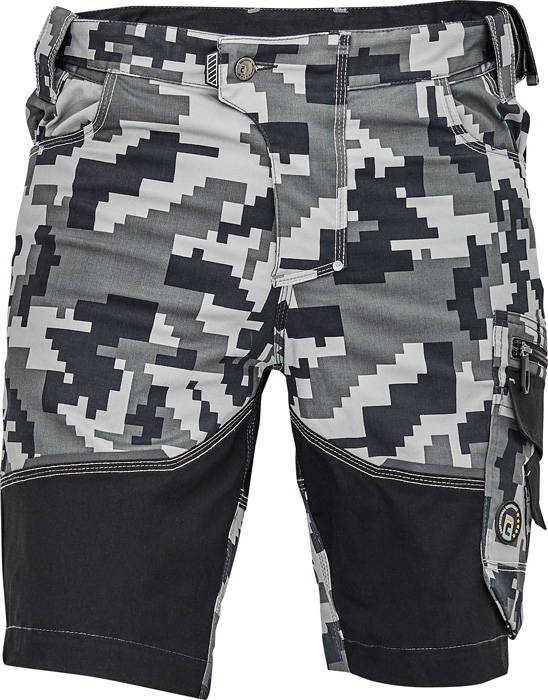 Popis: pánské pracovní šortky, elastický inovativní materiál TRIFIBETEX® v přírodním maskování, ergonomický střih, snížený pružný pas, odolné trojité prošití nohavic a sedu, prostorné multifunkční přední kapsy s poutky na nářadí, 2 zadní kapsy na suchý zip, stehenní kapsa na telefon s klopou a zapínáním na suchý zip, kapsa na metr a nůž, poutko na kladivo, "D" kroužek, poutko na nářadí v pase, originální zpracování zapínání kalhot, reflektivní prvky v barevném odstínu.