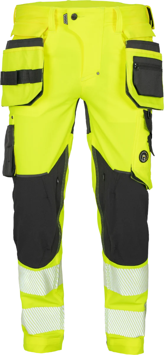 • pánské HI-VIS pracovní kalhoty s pružným pasem doplněné o 2 boční odepínatelné multifunkční "létající" kapsy • 2 zadní kapsy se zapínáním na suchý zip • 2 multifunkční stehenní kapsy • elastický inovativní materiál TRIFIBETEX VIS® • odolné trojité prošití nohavic a sedu • CORDURA® zesílení v oblasti kolen s možností vkládání kolenních výztuh • 7,5 cm široké tištěné segmentované reflexní pruhy • reflexní prvky v barevném odstínu • nastavitelná délka nohavic
